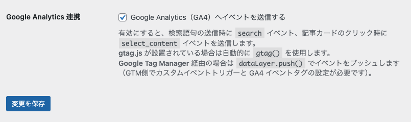 この設定をオンにすることで、プラグインが dataLayer.push() を使い GTM にイベントデータを送信するようになります。